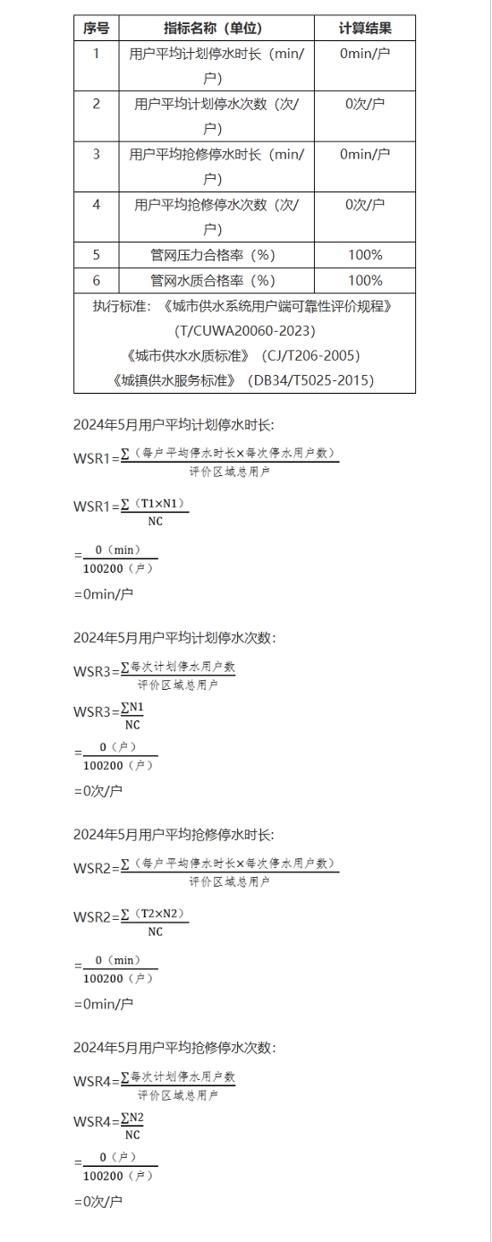 2024年5月份固镇中环水务供水可靠性关键指标数据