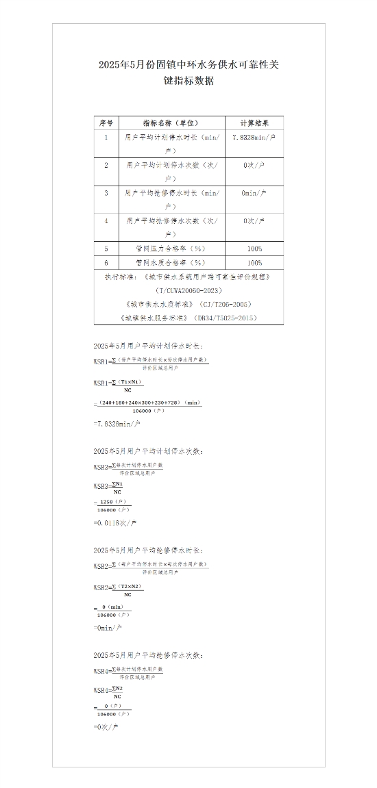 2025年5月份固镇中环水务供水可靠性关键指标数据