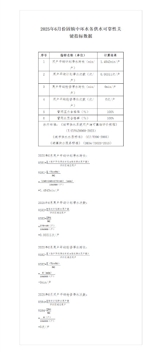 025年6月份固镇中环水务供水可靠性关键指标数据