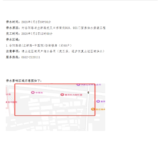 停水公告2025年7月2日对谷阳路段(立新路-中医院)沿街楼房停水