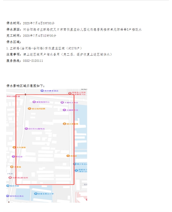 停水公告2025年7月4日对立新路(浍河路-谷阳路)东侧孟庄区域停水